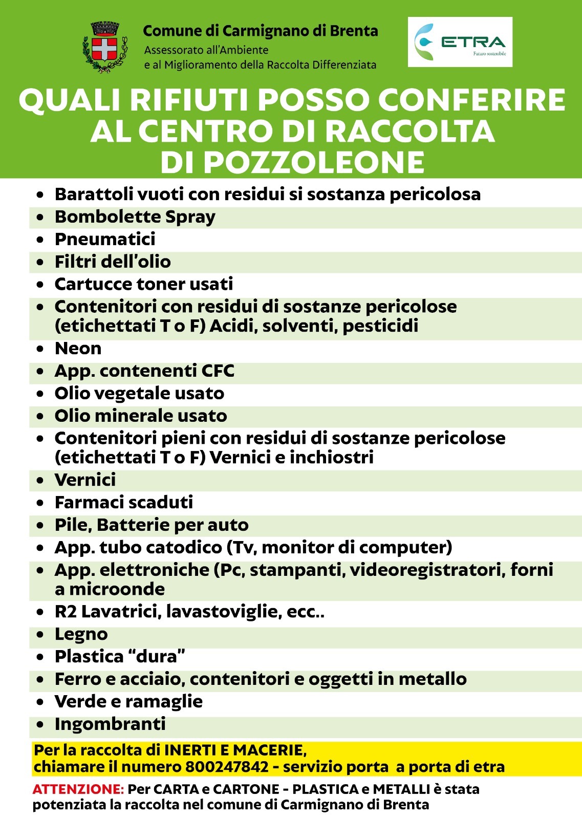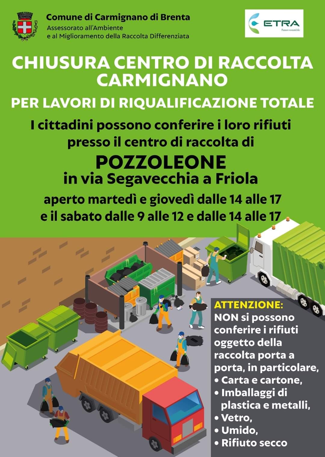 A causa della chiusura del Centro di raccolta di Carmignano di Brenta per la ripresa dei lavori di qualificazione, vi comunichiamo che il conferimento di verde e ramaglie e altre tipologie di rifiuti elencati nell'allegato a seguire, si effettua al Centro di raccolta di Pozzoleone in via Segavecchia a Friola con i seguenti orari: