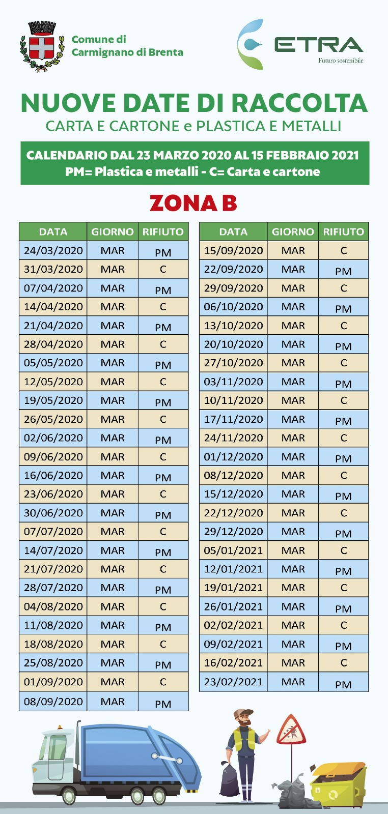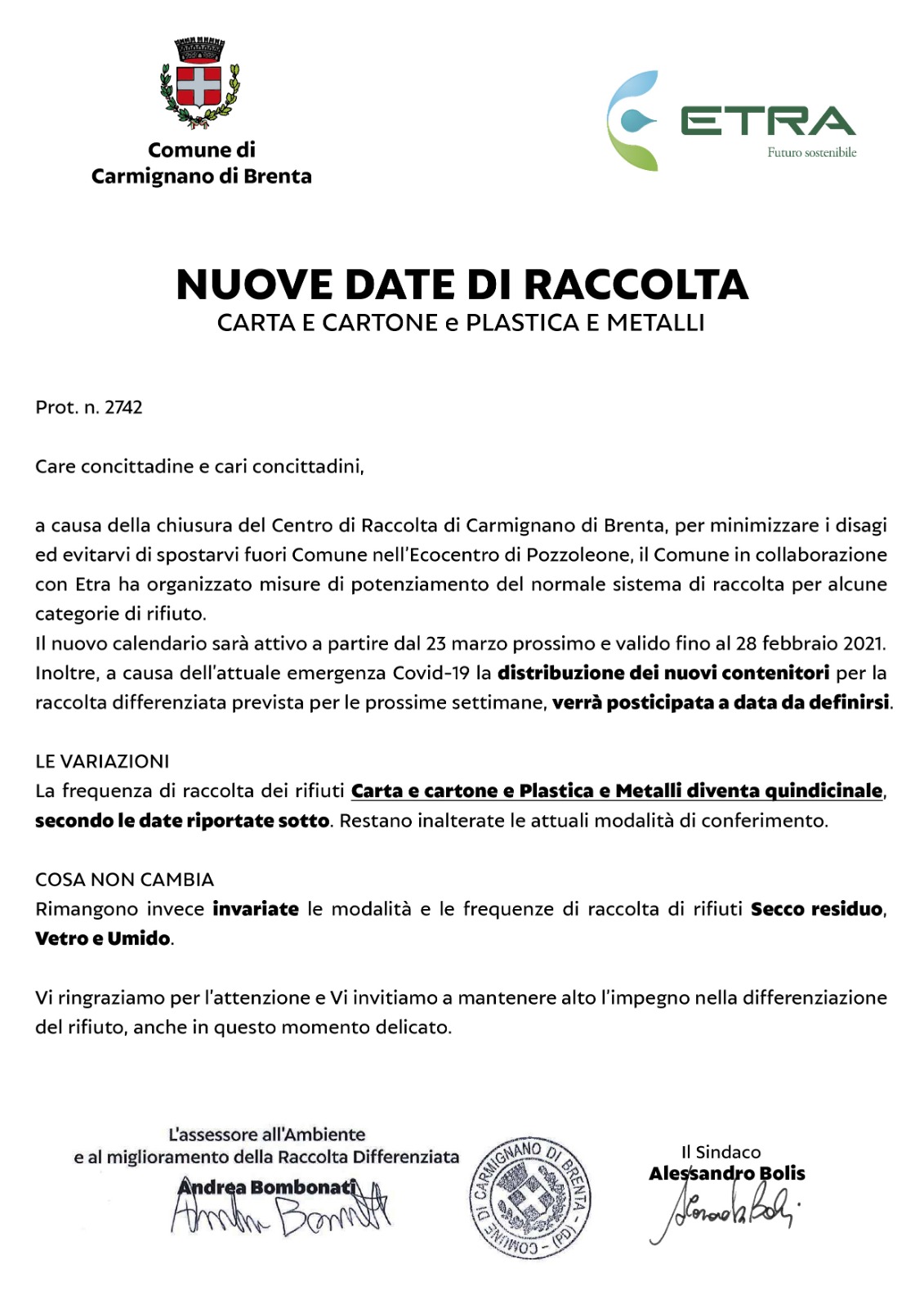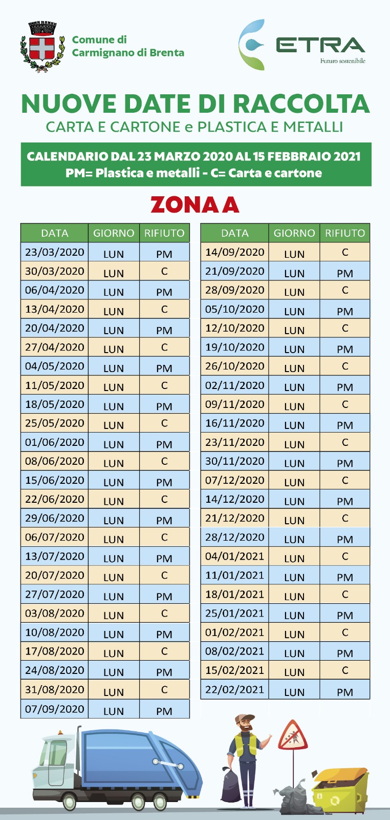 A seguire in allegato le nuove date di raccolta per carta e cartone e plastica e metalli, che ora diventa quindicinnale.