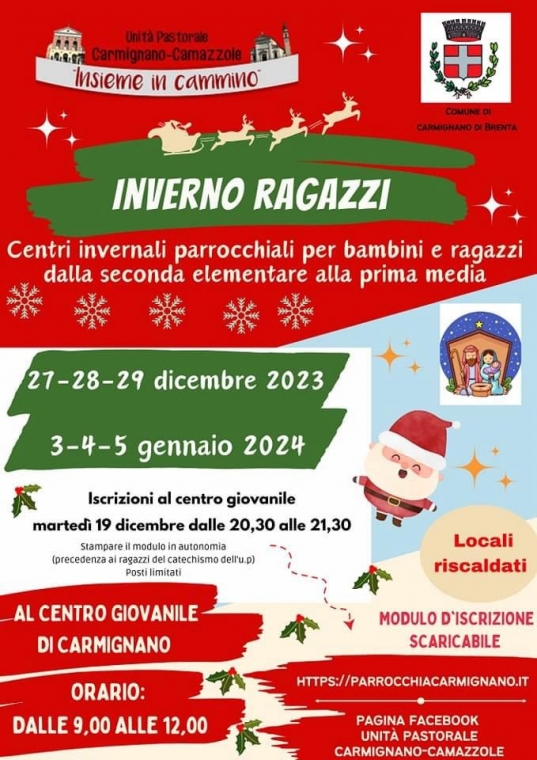 L’Amministrazione Comunale, in collaborazione con l’unità pastorale Carmignano-Camazzole, propone ‘INVERNO RAGAZZI 2023’ che si terrà dal 27 al 29 dicembre e dal 3 al 5 gennaio al centro giovanile a Carmignano di Brenta.