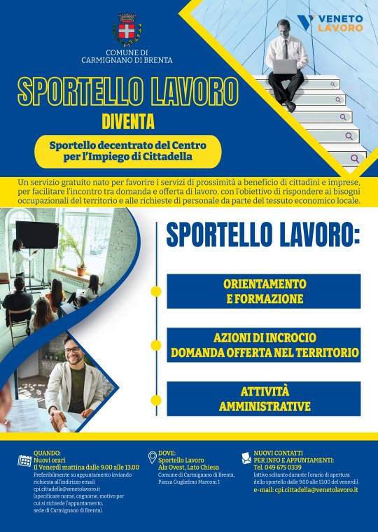 E' stato attivato grazie ad una Convenzione sottoscritta dall'Amministrazione Comunale e Veneto Lavoro e consentirà ai cittadini di Carmignano di Brenta e dei paesi limitrofi di ricevere informazioni e servizi di orientamento al lavoro direttamente presso lo Sportello collocato nell'Ala Ovest del Palazzo Municipale, senza doversi recare al Centro per l'Impiego territorialmente competente di Cittadella