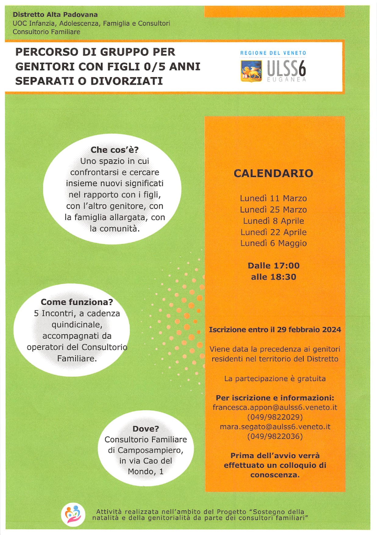 Si tratta di un percorso di gruppo per genitori, con figli 0/5 anni, separati o divorziati organizzato dall'ULSS 6 nell'ambito del Progetto "Sostegno della natalità e della genitorialità da parte dei consultori familiari".