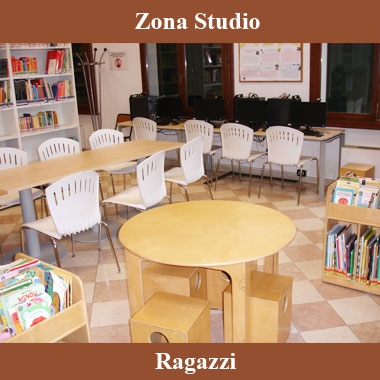 Al piano terra è presente una Zona Studio per i ragazzi dove svolgere ricerche di gruppo supportate da enciclopedie, computer e dal personale della Biblioteca, quando richiesto.